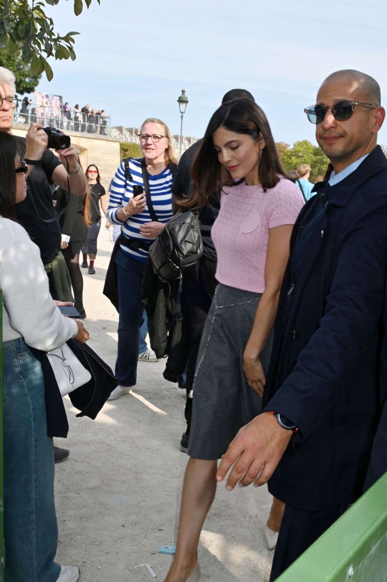 For the Parisian media event, Barbaro selected an outfit that masterfully played with texture and proportion. The upper garment is a delicate, short-sleeve knit crop top in a soft baby-pink hue, offering a subtle tactile element. This feminine piece contrasts beautifully with the wool-blend midi skirt in a rich heather gray. The skirt features a gentle A-line silhouette, falling just below the knee, a length that evokes classic 1950s Dior tailoring—a direct homage to the house’s heritage. The waistline is subtly defined by a fine, barely-there silver chain belt, which adds a modern, almost industrial touch to the otherwise soft look. Completing the look is a small, structured top-handle bag in a matching blush pink and a pair of nude pointed-toe pumps, ensuring the eye remains drawn to the core garments and the impeccable proportion play.