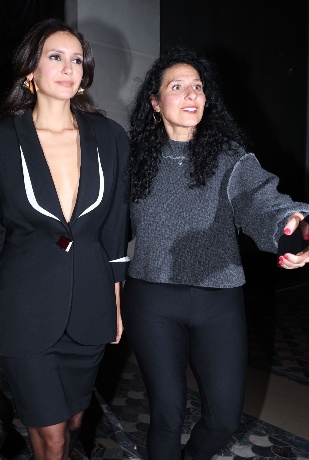 The core of Dobrev’s ensemble is a black suit crafted from what appears to be a smoothly draped crepe or fine wool. The silhouette is characterized by a single-button blazer that features strong, defined shoulders and a waist-cinching cut. The jacket plunges into a deep V-neckline, drawing attention to the striking precision details: a bold white satin or silk piping that contrasts sharply against the black fabric, tracing the edge of the lapels and the cuffs. This detail instantly elevates the piece, offering a contemporary spin on a classic silhouette. The jacket is paired with a matching black pencil mini-skirt, maintaining a sleek, uninterrupted line. Dobrev accessorizes with sheer black tights and classic black pointed-toe pumps, ensuring the lower half of the outfit remains refined. The finishing touches include large, geometric gold and amber drop earrings and a structured, small black handbag .