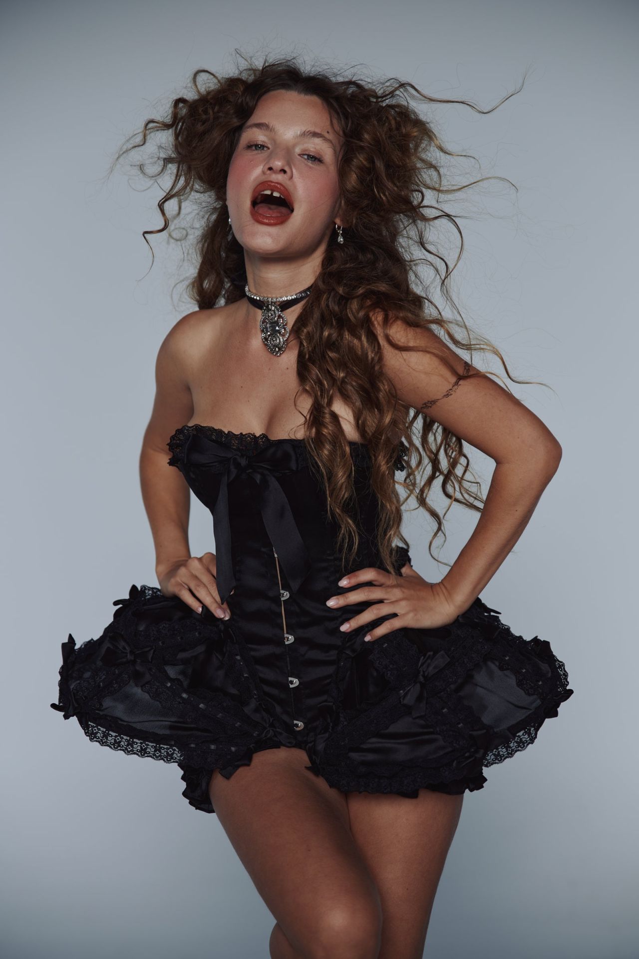 The ensemble is defined by its dramatic all-black aesthetic. The top is a traditional, strapless corset featuring boning and a front hook-and-eye closure, rendered in a crisp, matte fabric that lends a structured, precise feel to the hourglass silhouette. The corset acts as a severe counterpoint to the bottom: a separate, voluminous mini-skirt constructed from multiple horizontal satin ruffle tiers. The skirt’s ruffles are intentionally aggressive, exaggerated by visible satin ribbon ties that hang loosely, enhancing the outfit’s deconstructed, rebellious spirit.