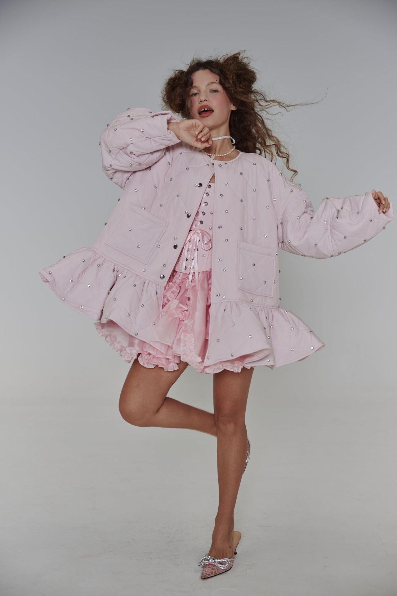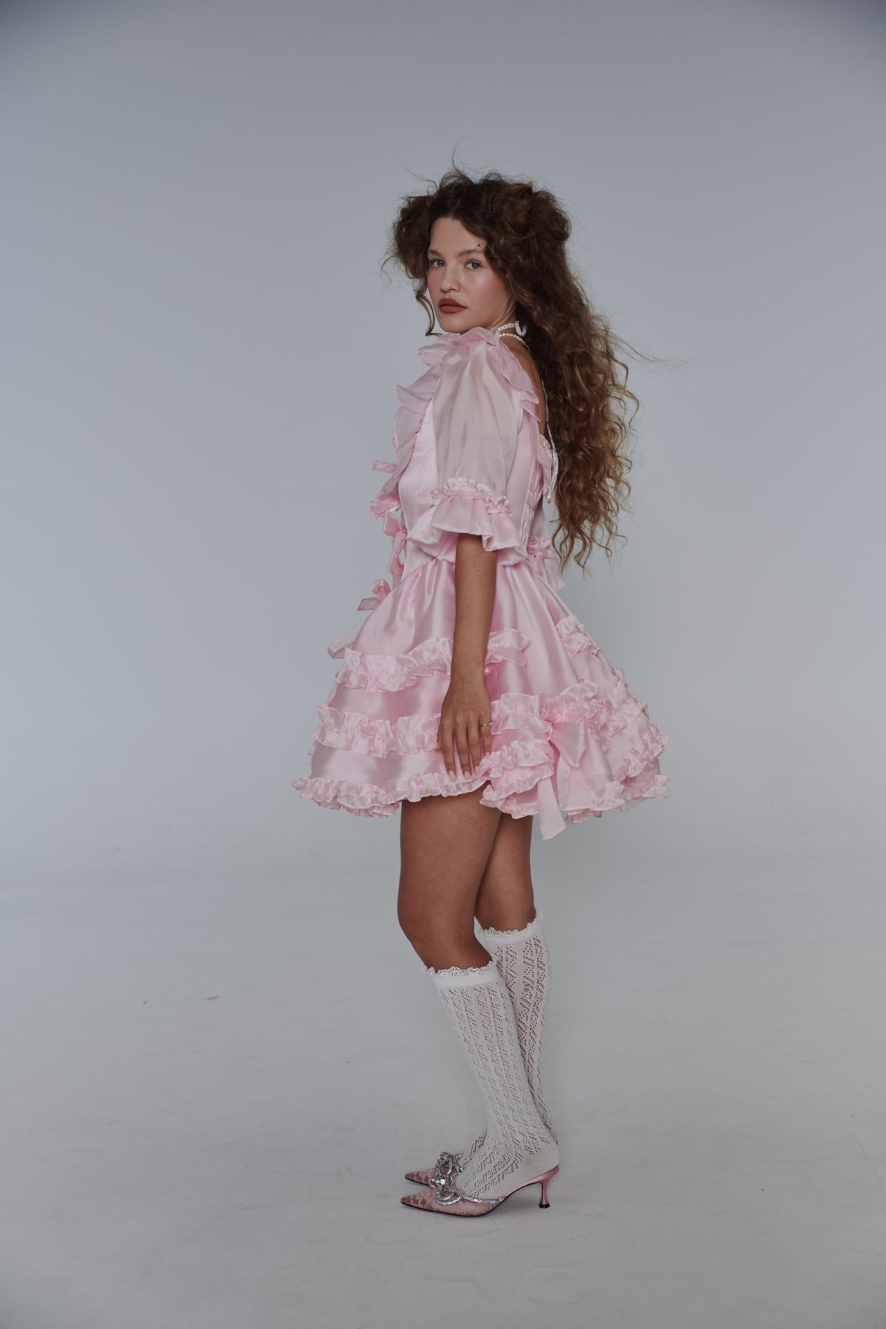 Model Olga Obumova presents a definitive piece from the Selkie Fall 2025 “Libertine” collection, captured in a stylized photoshoot. This look distills the brand’s signature romantic maximalism into a succinct, playful mini-dress silhouette. By leaning heavily on visual elements associated with the popular Coquette aesthetic and Regencycore, the outfit immediately positions itself as a key reference for current celebrity style trends that celebrate deliberate, exuberant femininity.