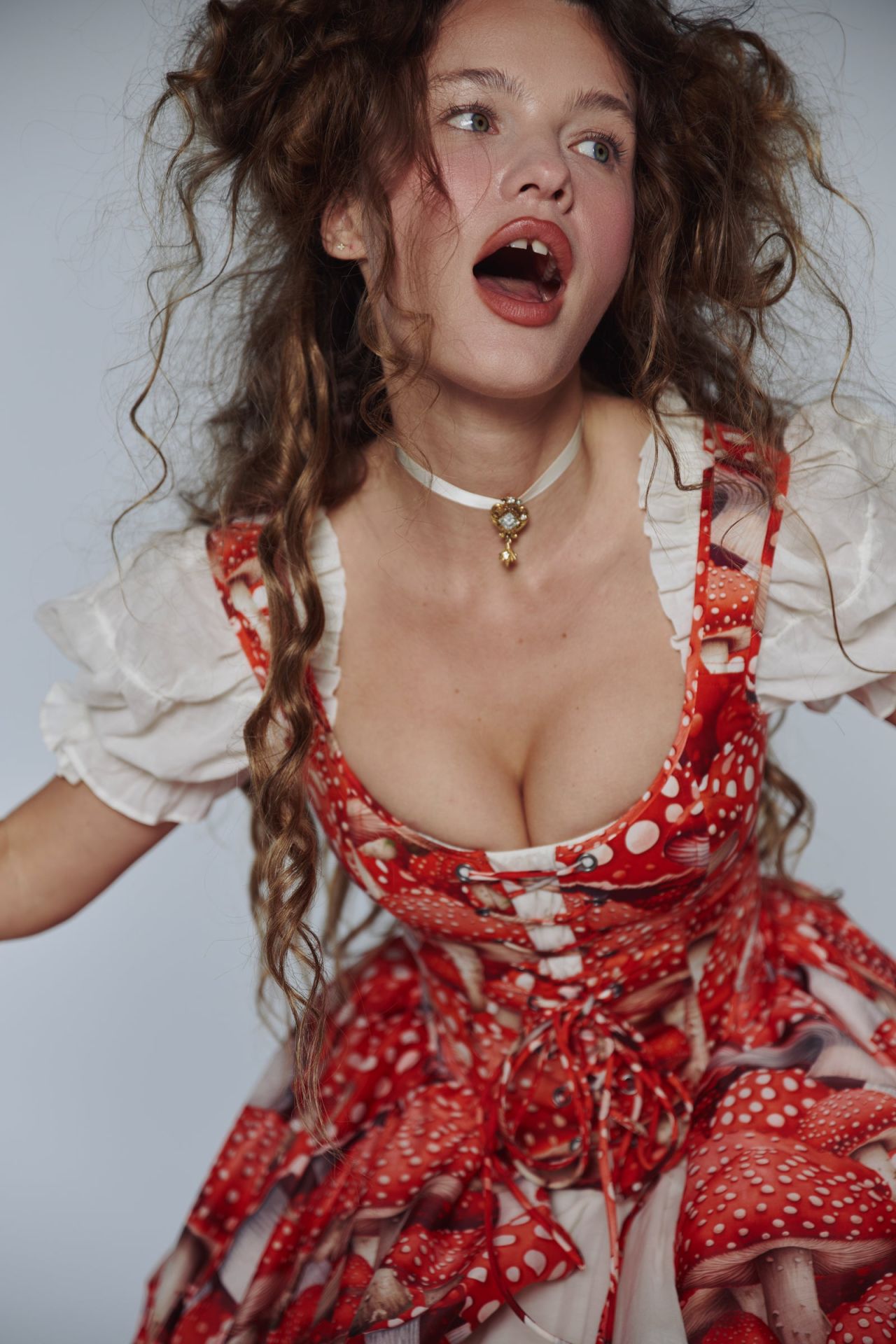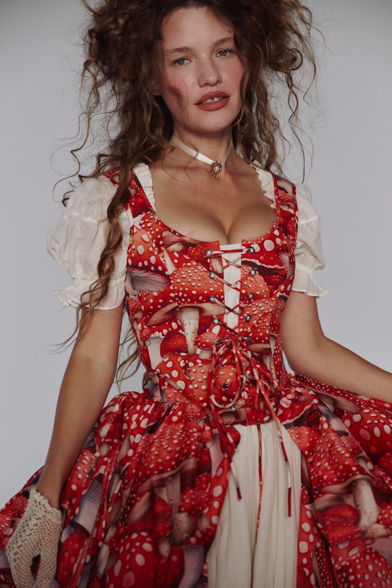 Model Olga Obumova opts for a truly maximalist look from the Selkie Fall 2025 “Libertine” collection, showcasing a fantastical mushroom-print gown. This highly stylized choice is a core example of how the brand uses prints and historical volume to create highly shareable fantasycore moments in fashion spread content, pushing the boundaries of contemporary romantic fashion.
