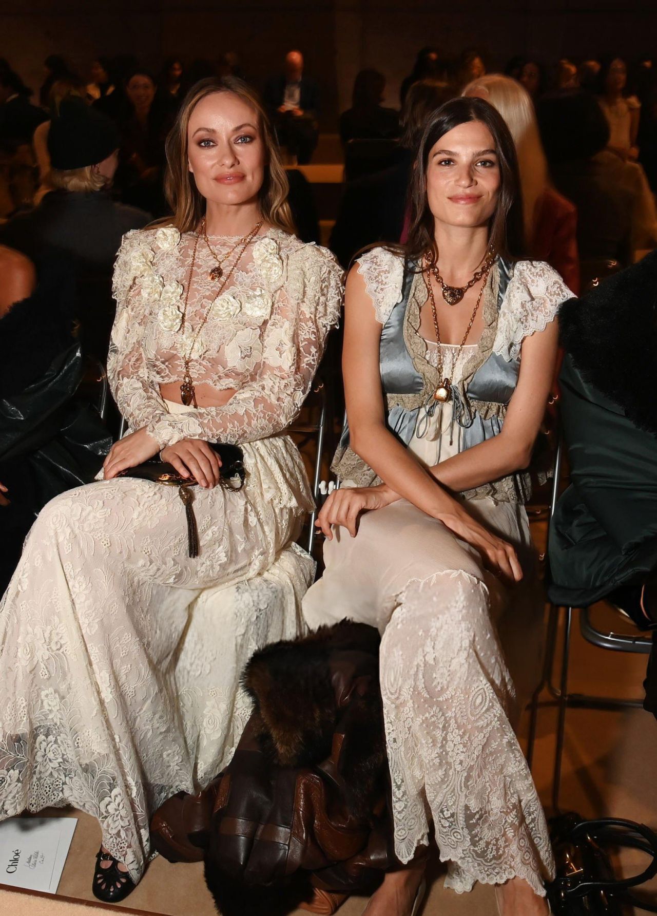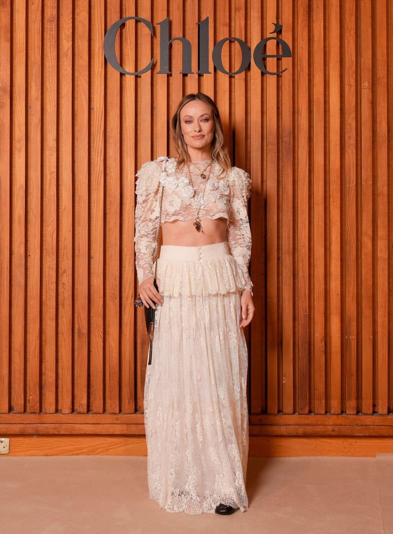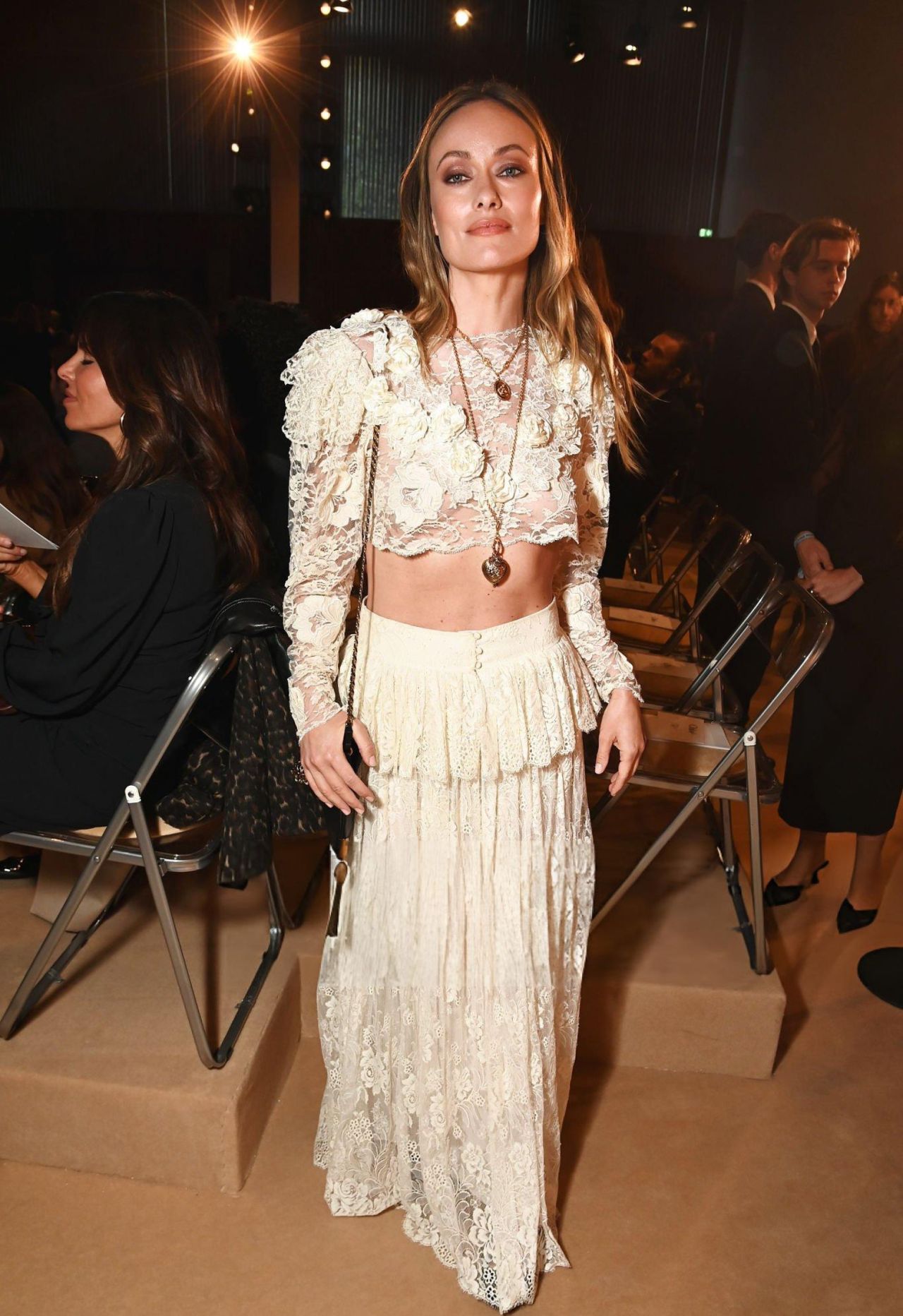 Olivia Wilde (IMDb) attended the Chloé fashion show as part of Spring/Summer 2026 Paris Fashion Week, presenting a light and textured event appearance look. Her outfit, likely a Chloé Fall 2025 ensemble as per the context, consists of a cropped, long-sleeved top and a matching floor-length skirt. The top features dramatic, voluminous puffed sleeves and a raw, asymmetrical ruffle that highlights the midriff. The skirt is flowy, crafted from layered lace with a prominent tiered ruffle at the high waistline, giving it a playful, romantic volume before falling into a sheer, sweeping length.