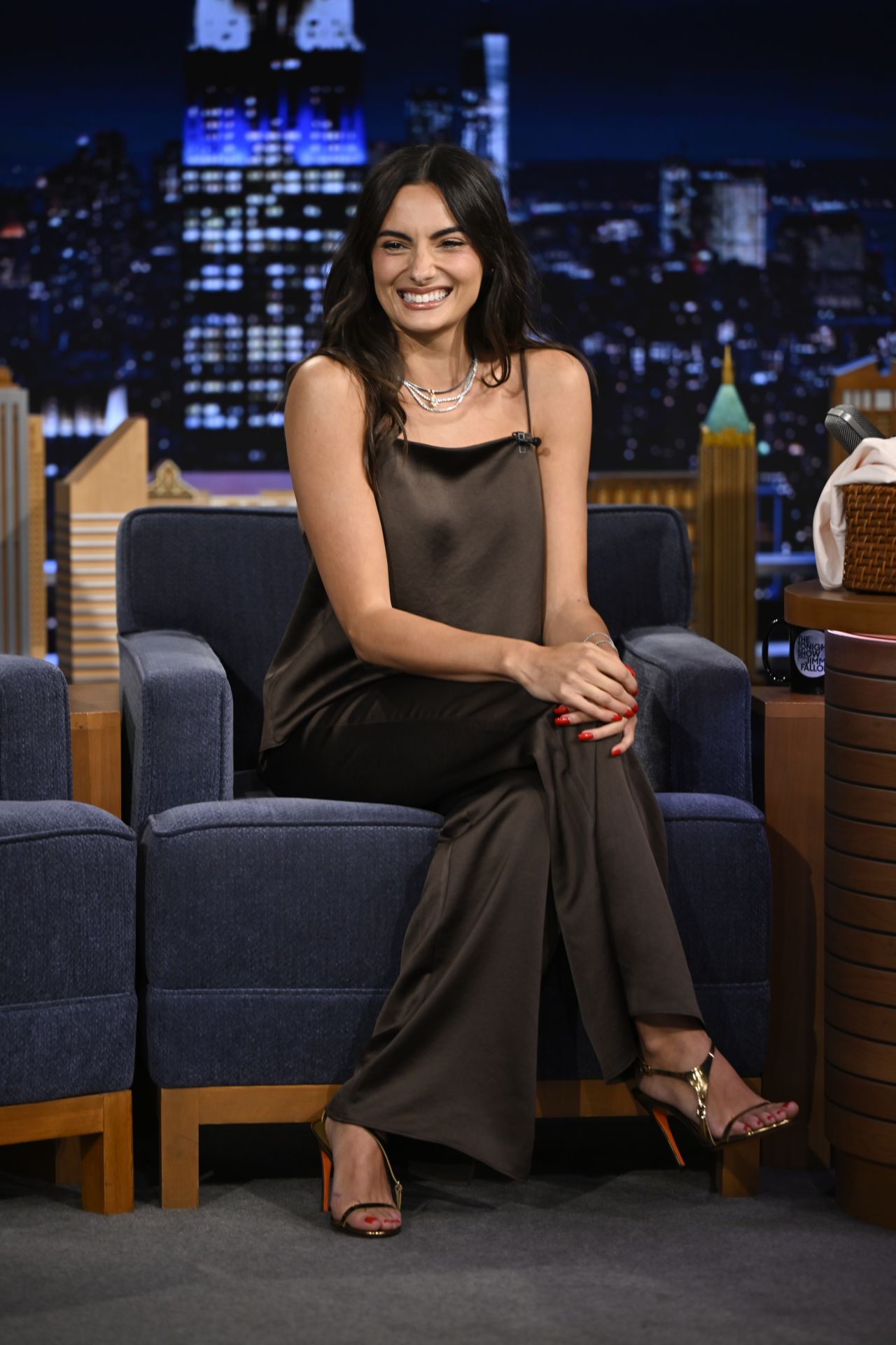 Paige DeSorbo, a television personality whose sartorial choices often influence contemporary celebrity style for public appearances, selected a slip-inspired look for her guest spot on The Tonight Show Starring Jimmy Fallon on October 8, 2025.