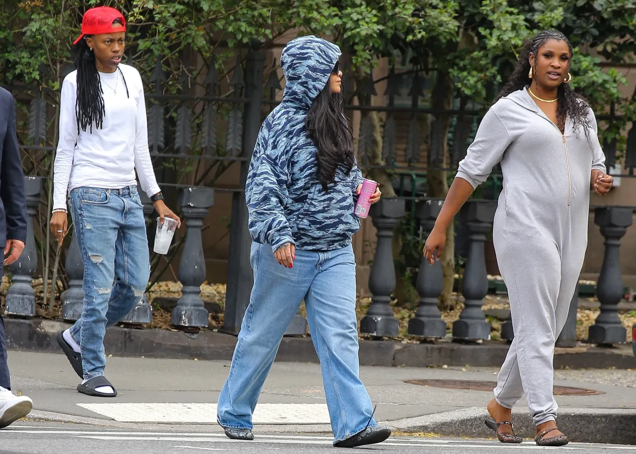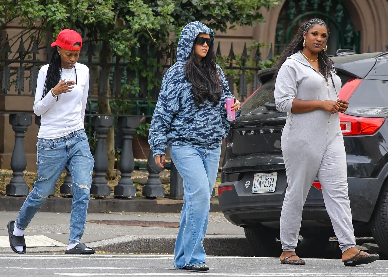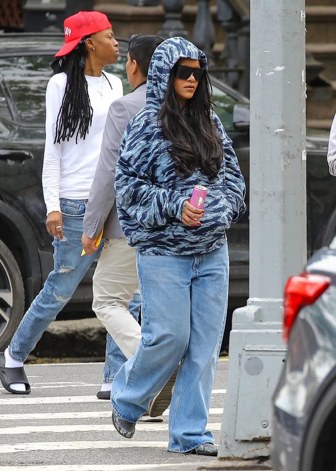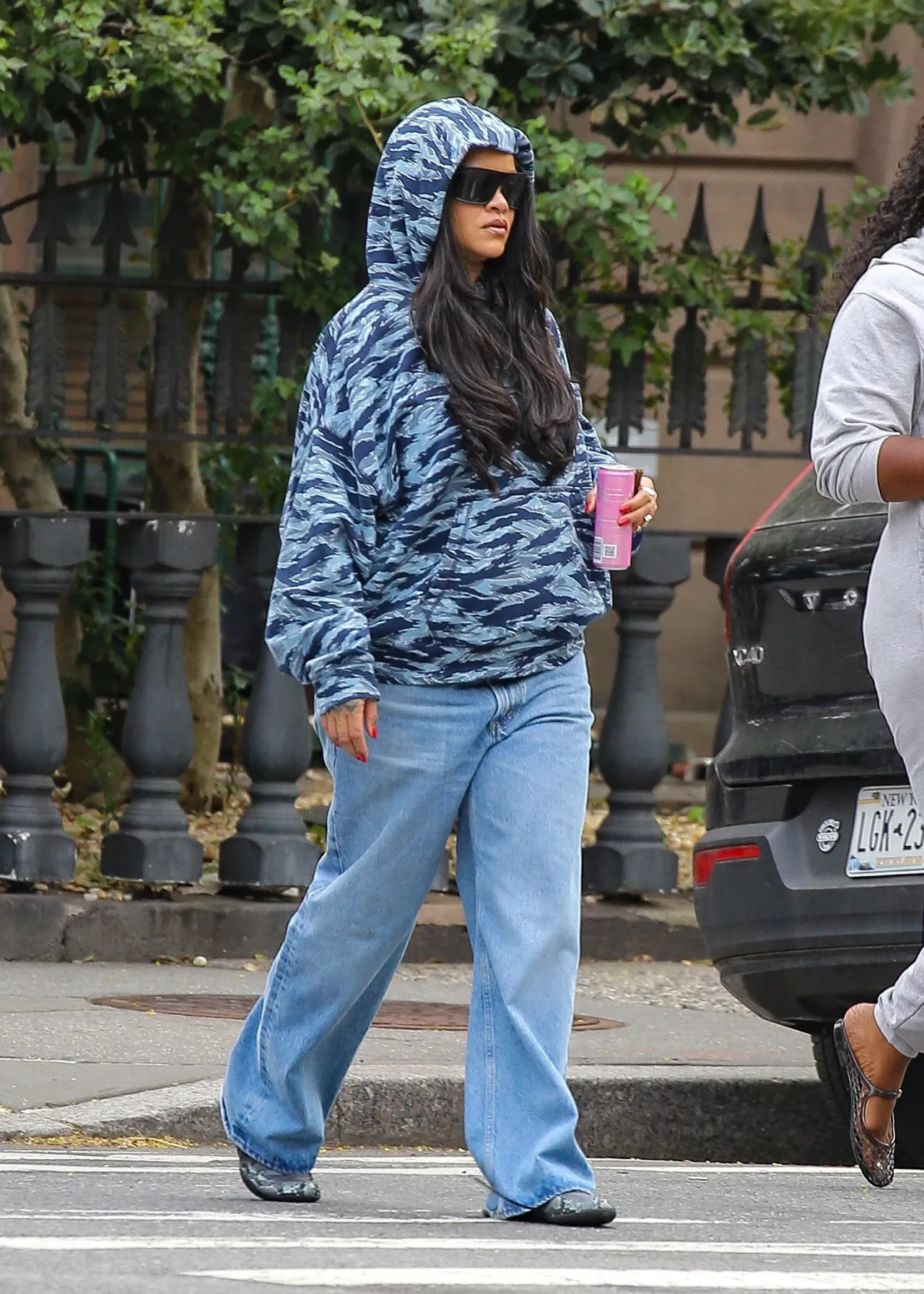Brooklyn errands for Rihanna in Savage x Fenty this April 2026 is exactly how you handle a mid-week slump. Hoodie up, massive shades on. It lands. The blue camo hoodie—Savage x Fenty, obviously—is the piece carrying this whole off-duty look.