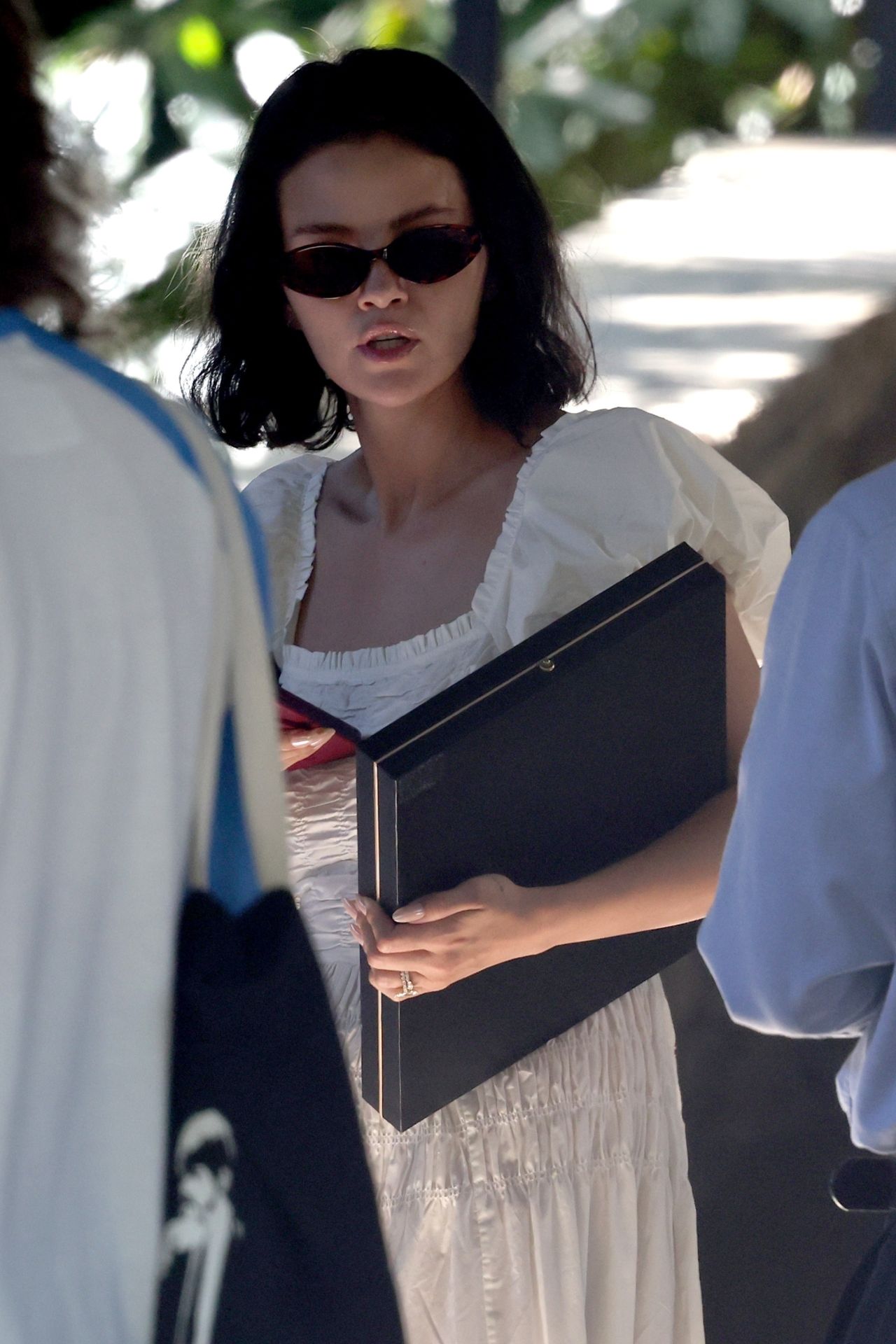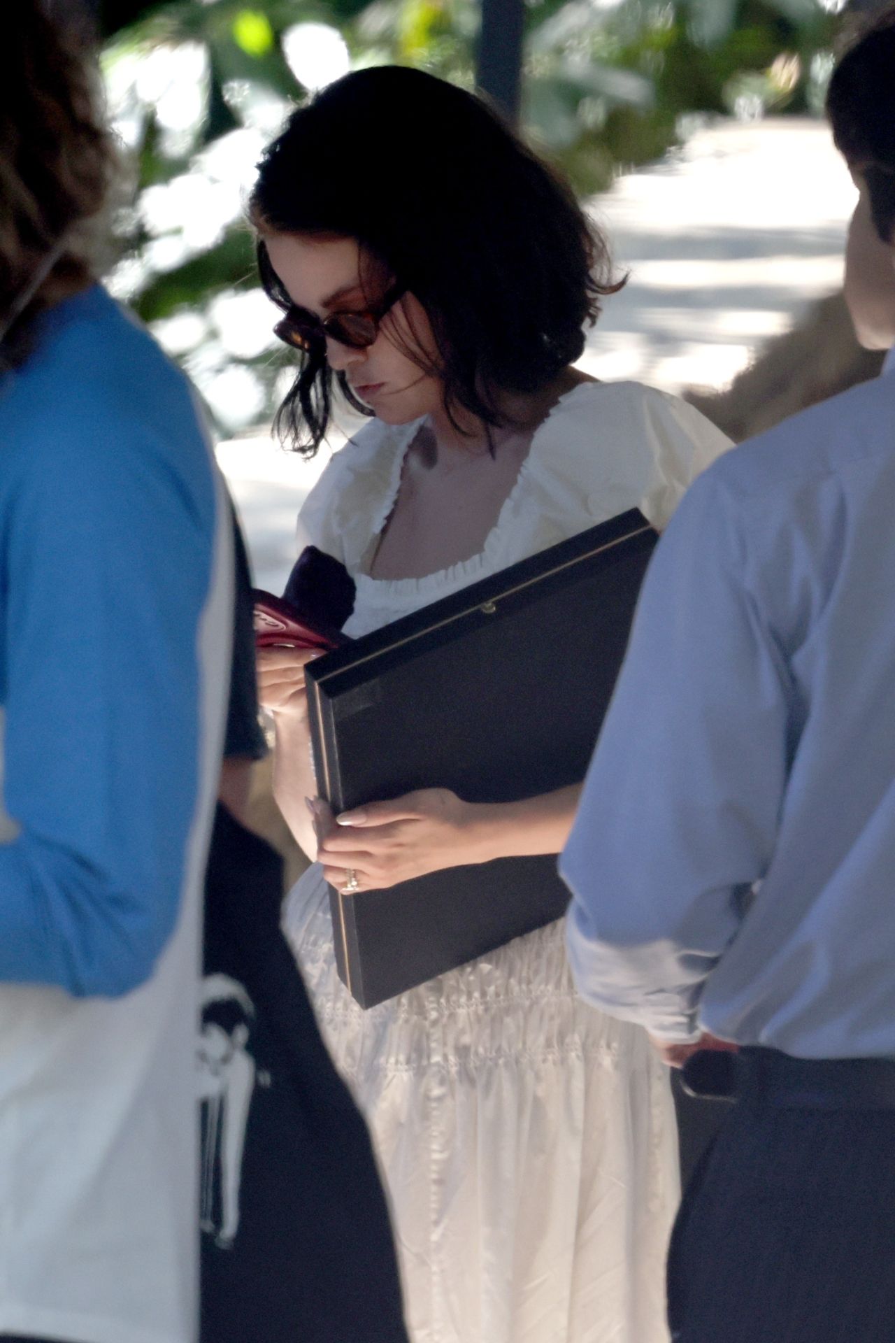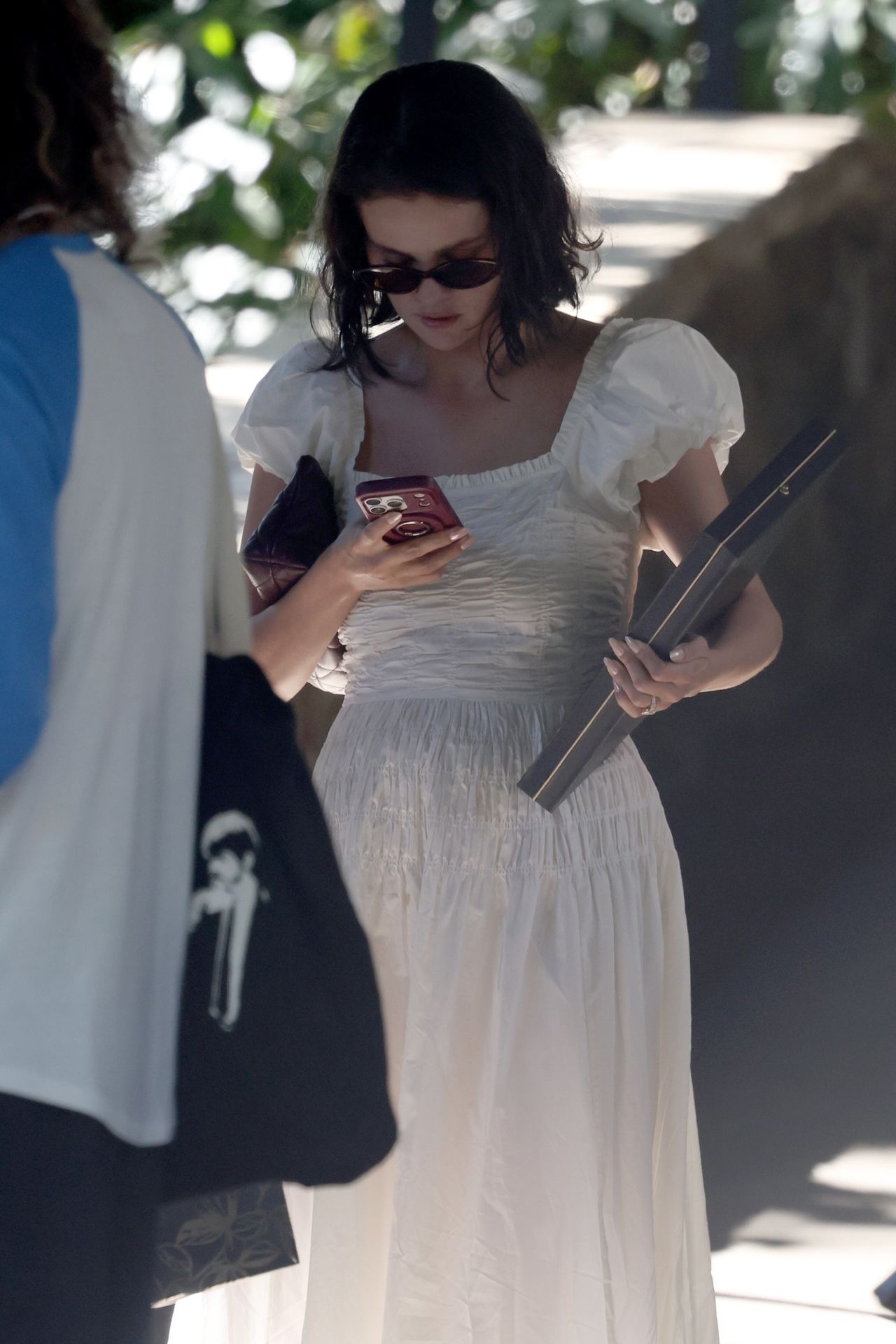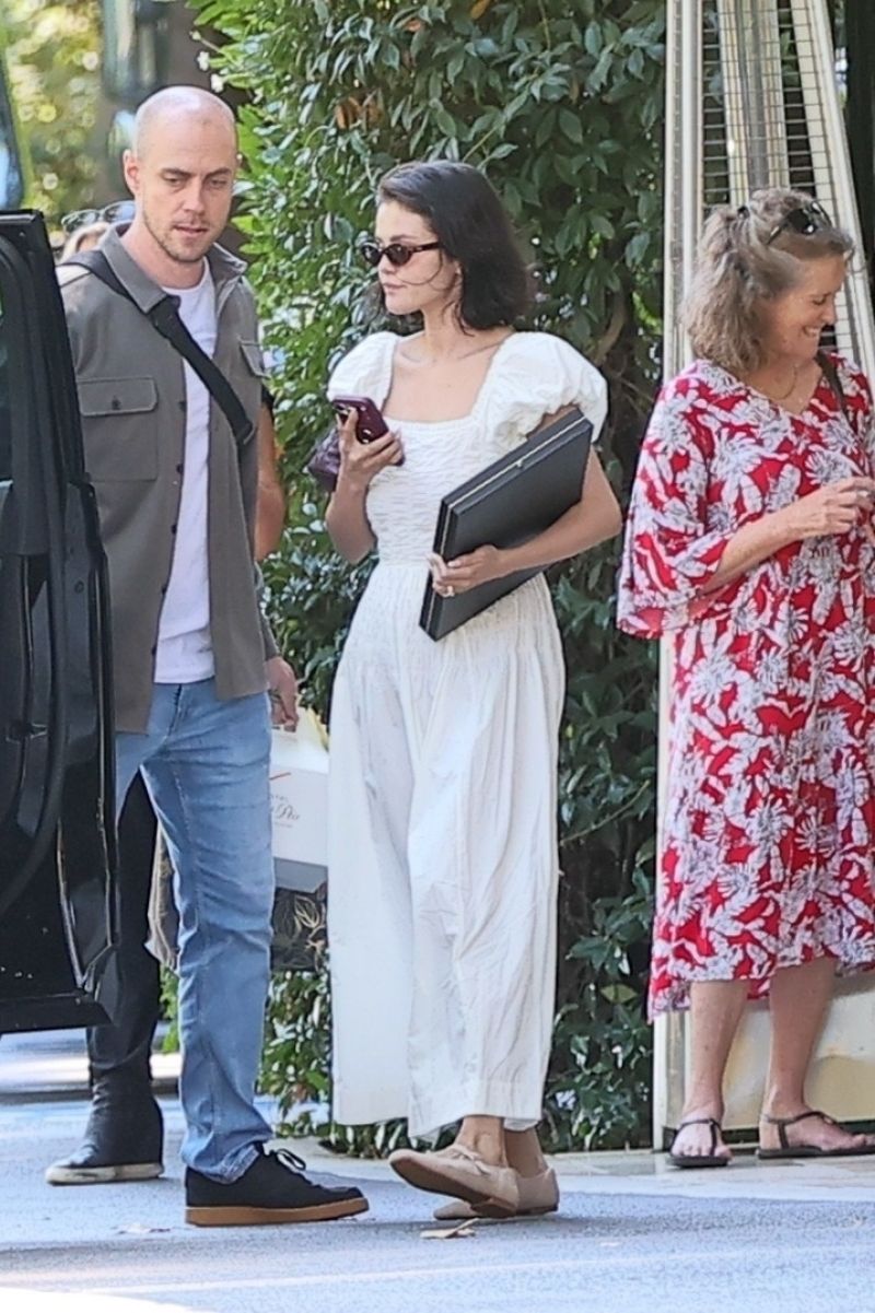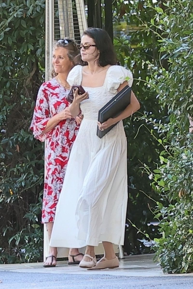 The look’s undeniable femininity and lightness were grounded by her choice of footwear: a pair of cream Vivaia Almond-Toe Mary-Jane Adaptall flats. Gomez embraced a clean aesthetic, accessorizing minimally with dark sunglasses and carrying a black portfolio-style binder and a small handbag. The look, though relaxed, possessed the refinement expected of celebrity street style, offering a vision of post-nuptial serenity.