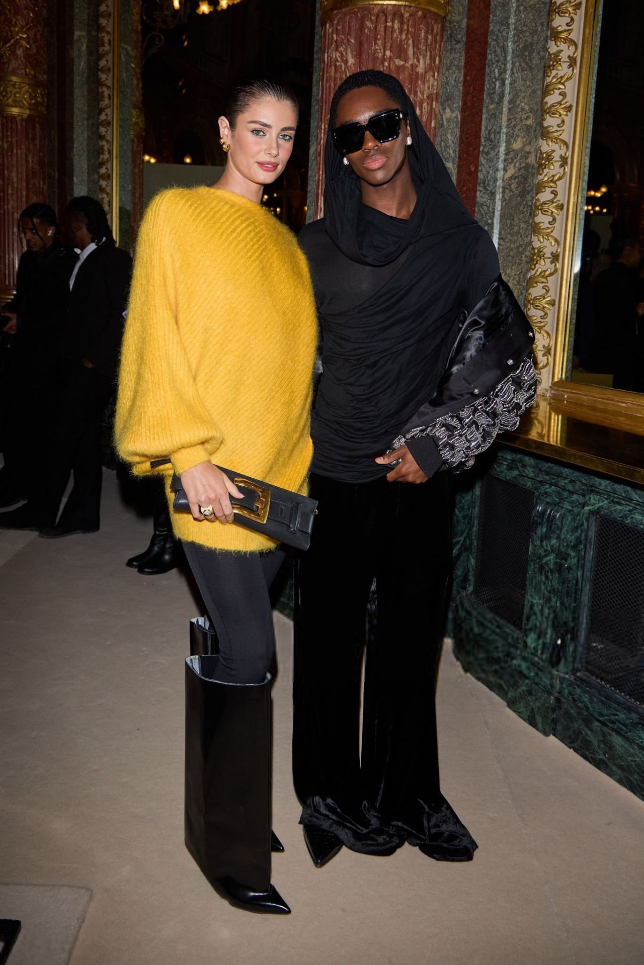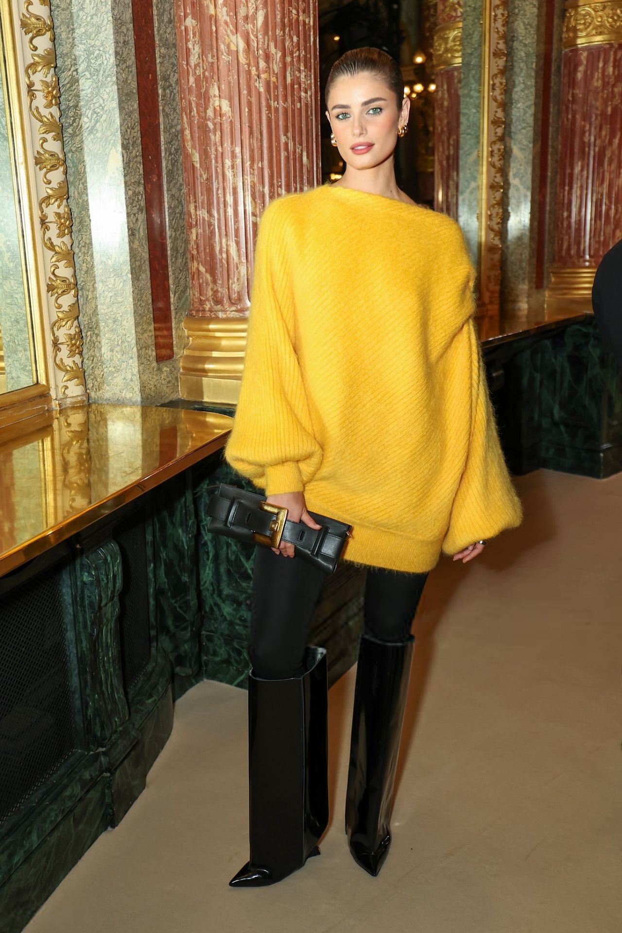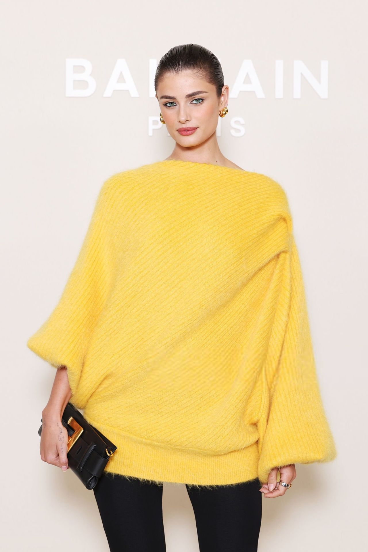 On October 1, 2025, Taylor Hill attended the Balmain Spring/Summer 2026 show during Paris Fashion Week, wearing a mustard yellow off-shoulder knit sweater, black leather pants, and knee-high black leather boots, accessorized with a Balmain Anthem calfskin leather clutch—a look that balanced bold color with Parisian polish.
