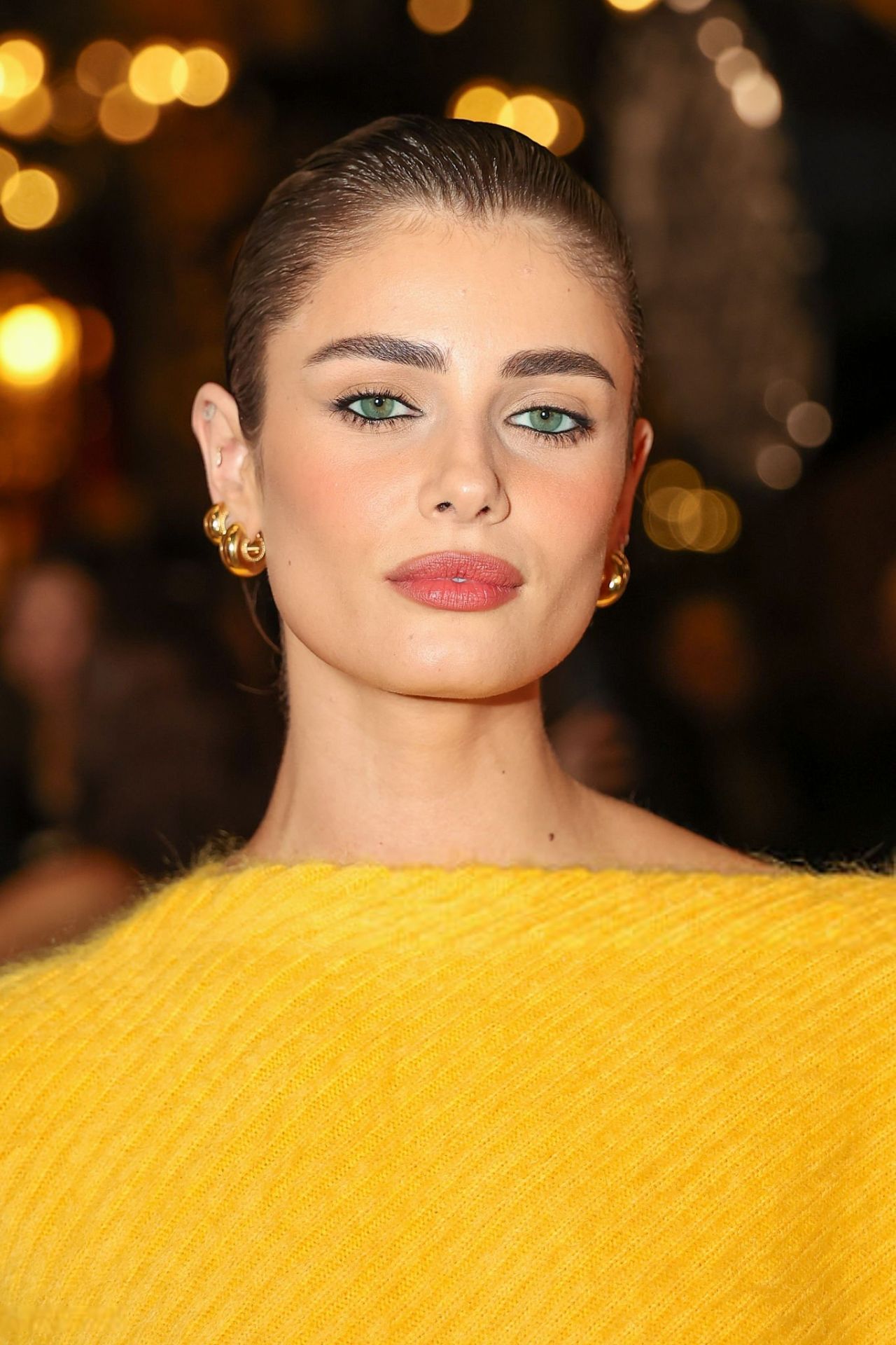 Taylor Hill’s styling here marks a shift from her typically girly, romantic red carpet looks (think: flowy gowns and delicate fabrics). This ensemble showcases a more assertive, urban side, proving her ability to adapt to the Parisian fashion landscape—where boldness and minimalism coexist.