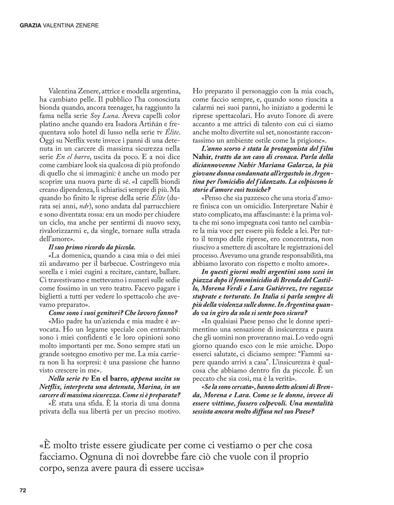 The editorial is not just about fashion; it is deeply intertwined with Zenere’s identity and personal journey. In the accompanying interview, she speaks candidly about her transition from playing the wealthy character Isadora in Élite to taking on roles of “strong and extreme girls” like the character Nahir Galarza in En el barro, who is a young woman condemned for the murder of her boyfriend in Argentina. She connects her personal evolution to her career, stating, “I am free because now I love myself,” suggesting she has fought against the insecurity that made her so severe with herself. Zenere highlights the challenges of machismo that still prevent women in her country, and elsewhere, from feeling in control of their own lives, adding a layer of social commentary to the strong visual aesthetic.