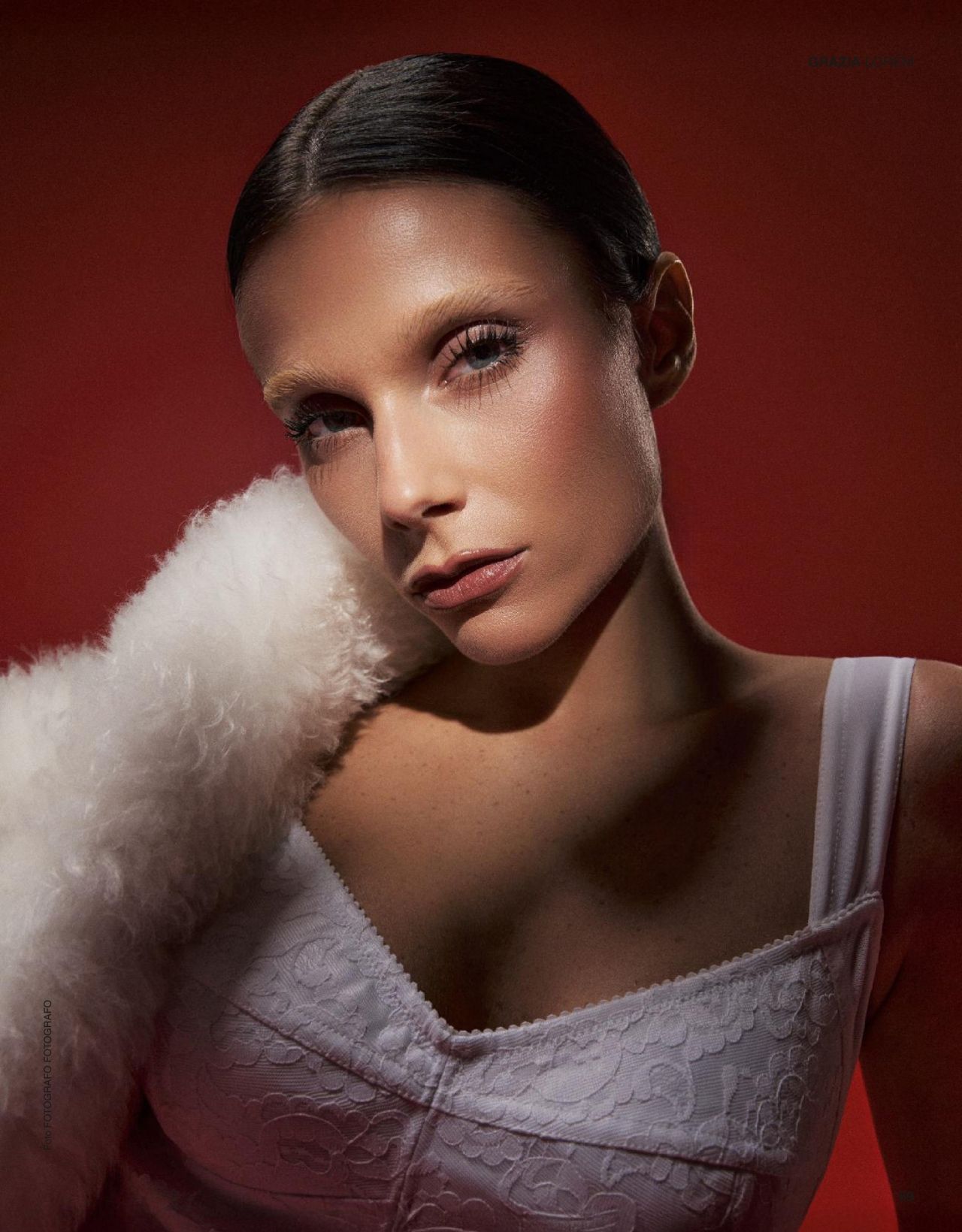 Valentina Zenere appears on the cover of Grazia Italia issue N. 44, dated October 9, 2025, embracing a high-impact fashion moment that contrasts extreme volume with exposed skin. The actress, known for her roles in shows like Élite and the upcoming En el barro, opts for a luxurious, oversized white fur or shearling coat that dominates the composition. The coat features a shaggy, dense texture and is held closed by wide, dark buckles, creating a focal point of dramatic contrast. The look is completed with a pair of patent leather open-toe heels in glossy black, their height emphasizing the length of her legs—the most visually prominent feature against the coat’s bulk. Her styling is severely modern, with hair pulled back tightly and stark, minimal makeup.
