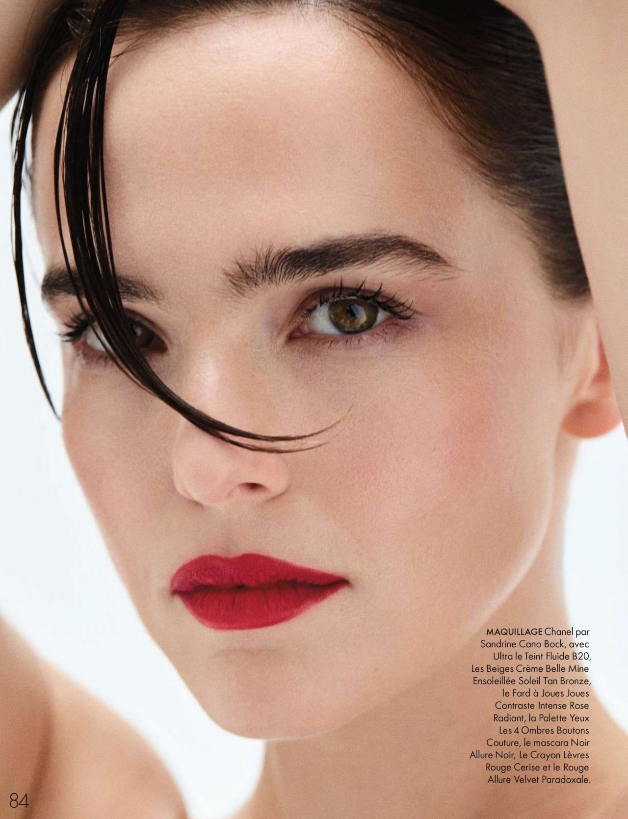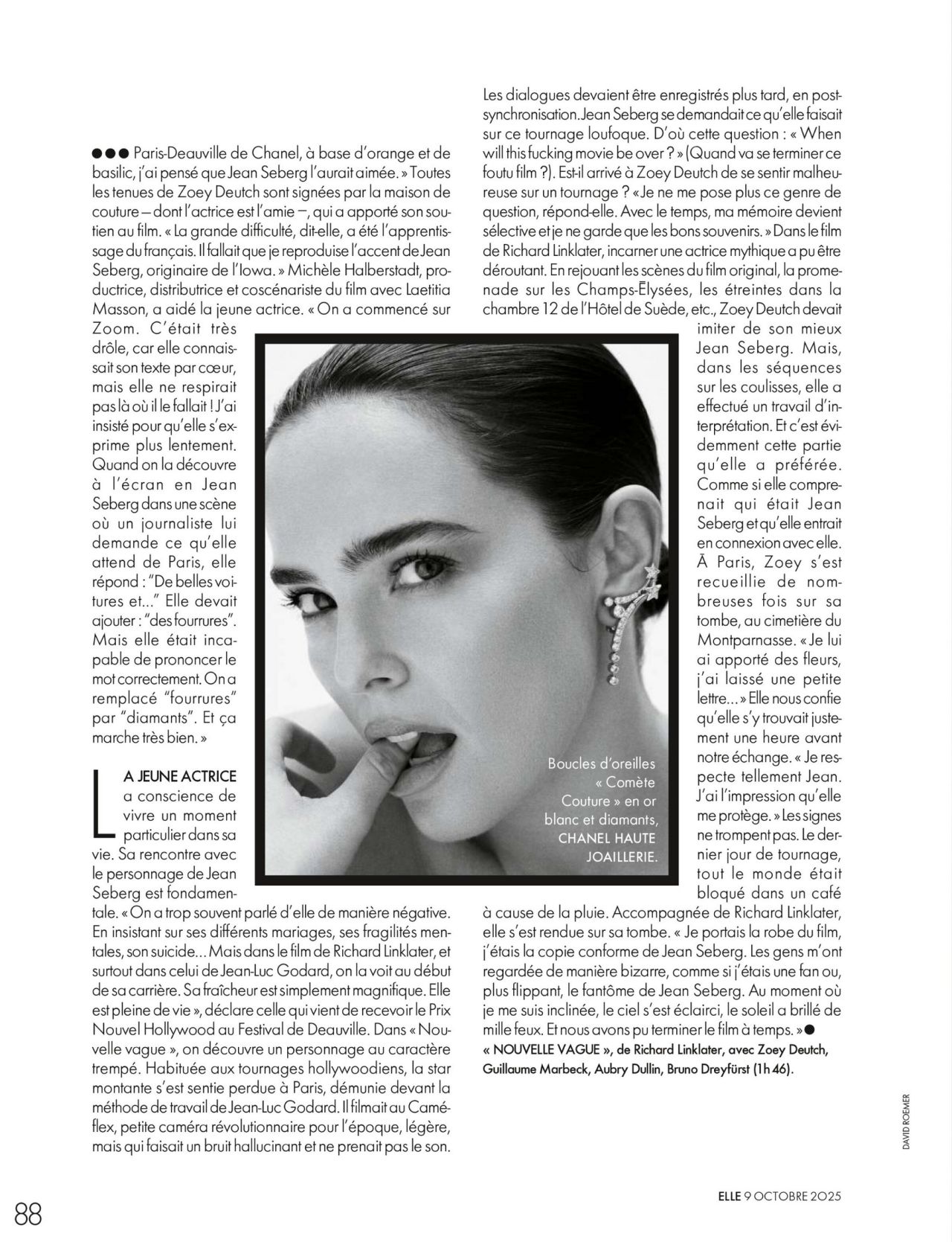 The editorial also features Deutch in a close-up shot, where her bold Chanel Joaillerie earrings take center stage. The white gold and diamond earrings, with their geometric design, add a touch of couture drama to her minimalist styling. Her sleek hair and natural makeup ensure the focus remains on the architectural lines of the coat and the sparkle of the earrings.