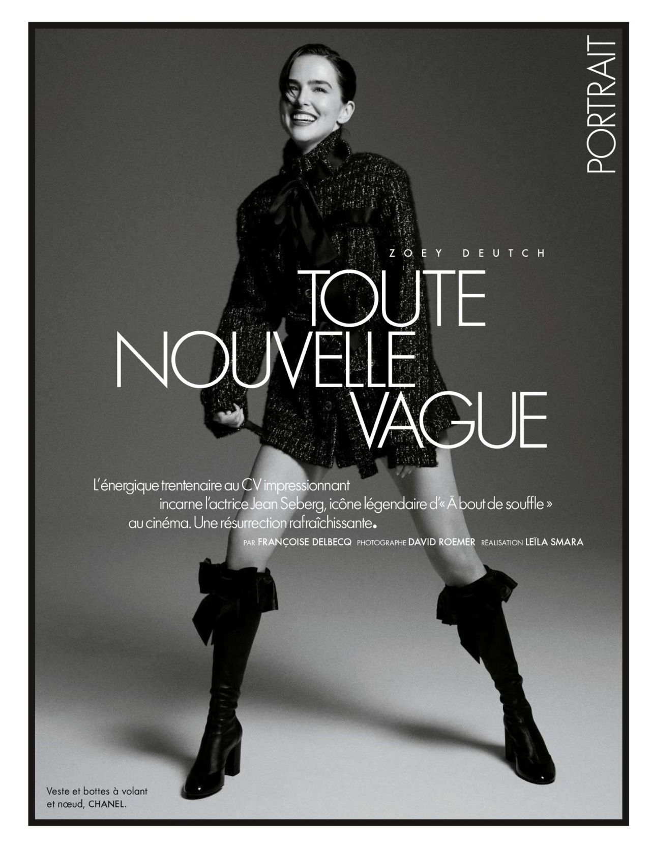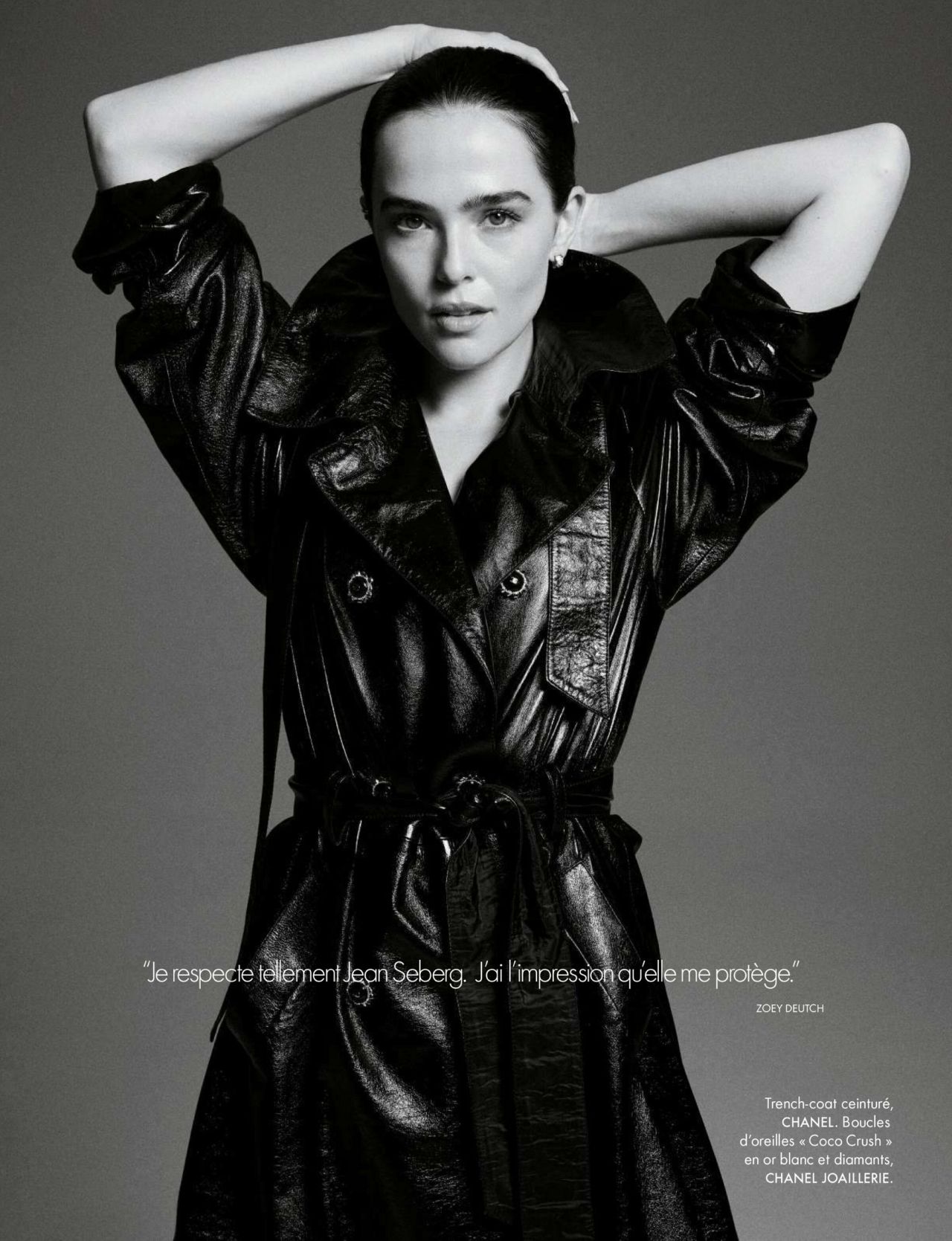 Zoey Deutch graces the pages of ELLE France’s October 2025 issue with a masterclass in timeless elegance. The actress is captured in a Chanel trench coat, its belted waist and structured silhouette exuding effortless Parisian chic. The coat’s glossy finish and oversized lapels add a modern twist to the classic design, while Deutch’s confident pose—arms raised, head slightly tilted—infuses the look with a sense of effortless cool.